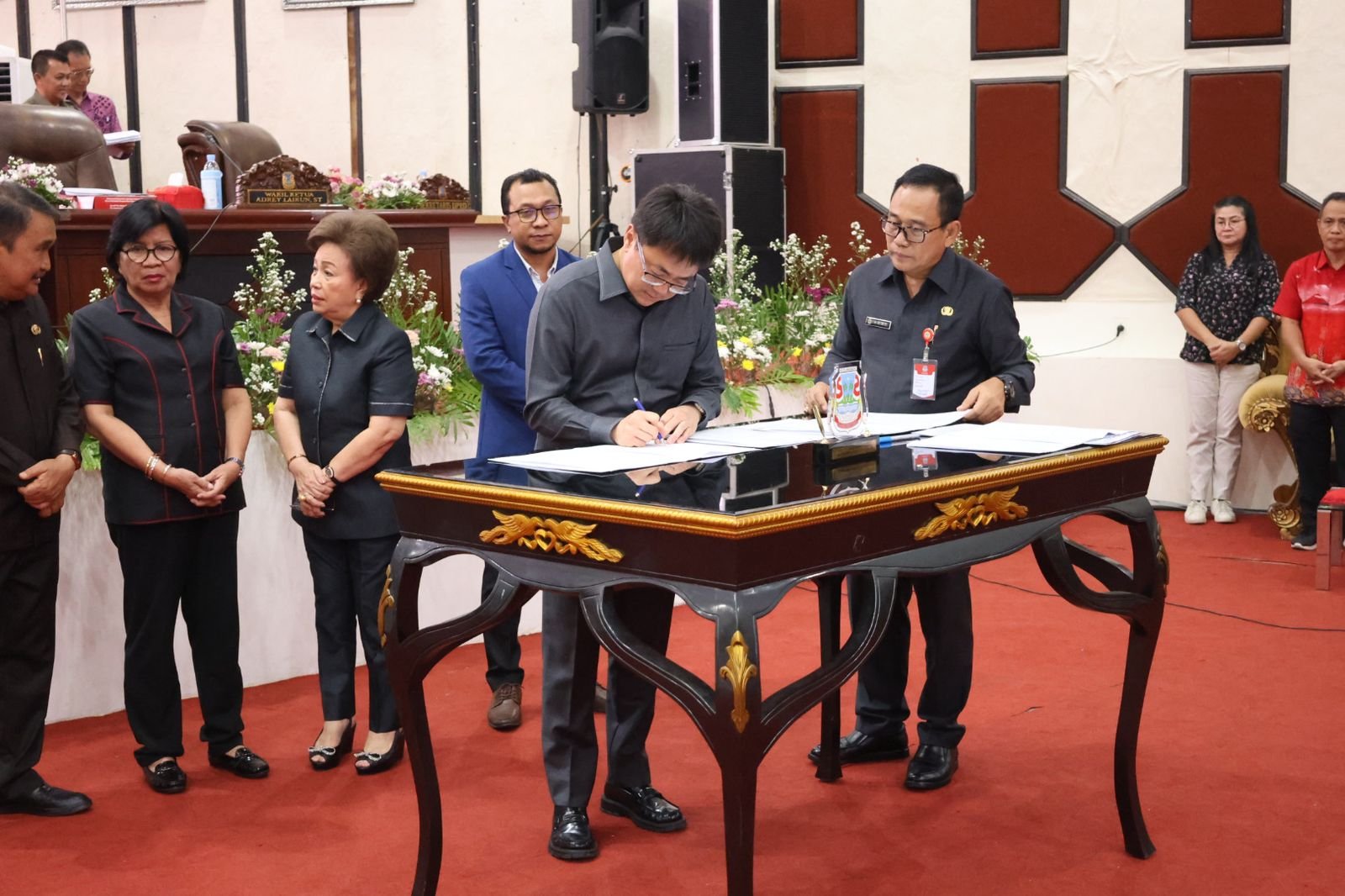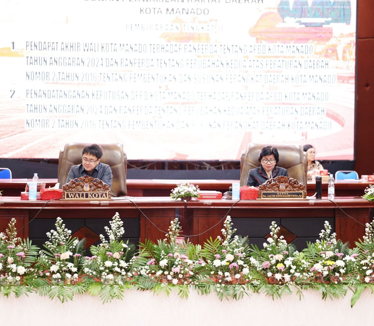 Usai mendapat persetujuan semua anggota DPRD yang hadir agar Ranperda-Ranperda ini ditetapkan sebagai Perda, acara dilanjutkan dengan Penandatanganan Keputusan DPRD Kota Manado terhadap Ranperda APBD Kota Manado Tahun Anggaran 2024 dan Ranperda tentang Perubahan Kedua Atas Peraturan Daerah nomor 2 tahun 2016 tentang Pembentukan dan Susunan Perangkat Daerah Kota Manado.