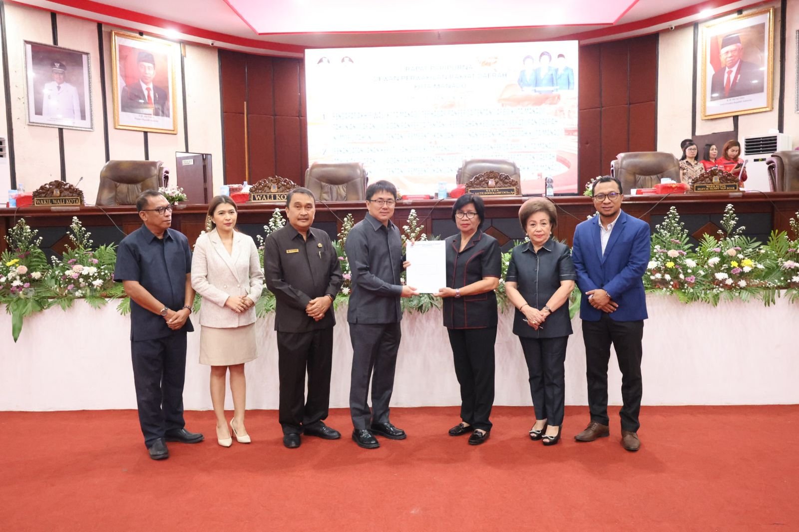 Penandatanganan ini melibatkan Ketua dan Pimpinan DPRD Kota Manado, Sekretaris Pemerintah Kota dan Walikota Manado. Selesai penandatangan diserahkan surat keputusan dari Ketua DPRD kepada Wali Kota Manado.