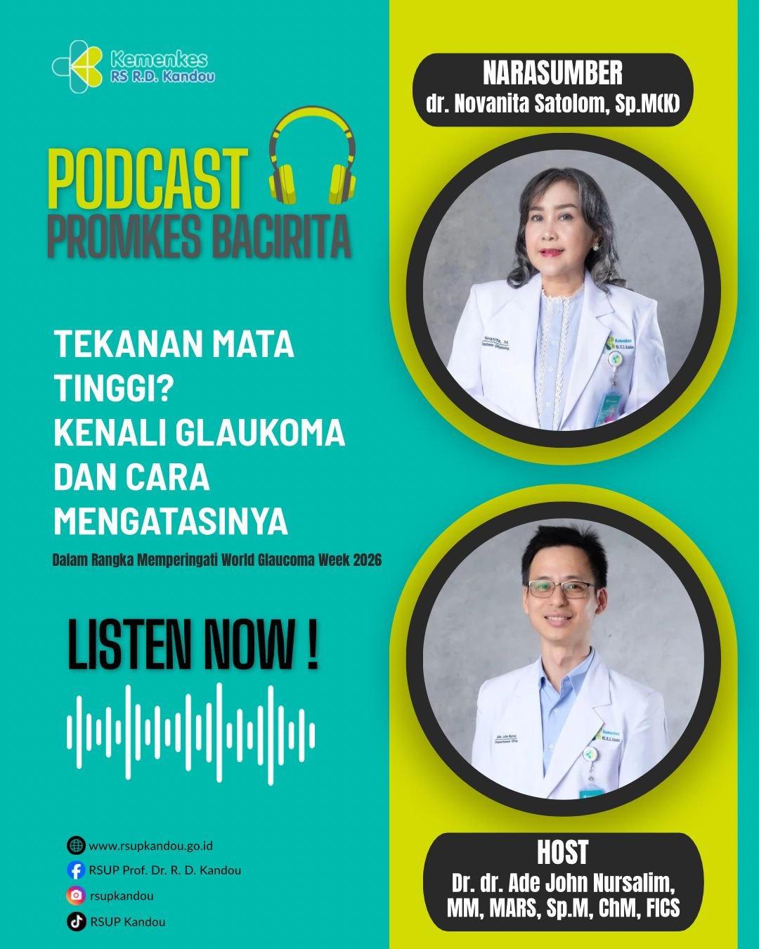 Manado, VoxSulut.Co.id — Memperingati World Glaucoma Week 2026, RSUP Prof. Dr. R. D. Kandou melalui Instalasi Promosi Kesehatan Rumah Sakit (Promkes) menyelenggarakan kegiatan edukasi kesehatan melalui program Podcast Promkes Bacirita dengan tema “Tekanan Mata Tinggi? Kenali Glaukoma dan Cara Mengatasinya”.